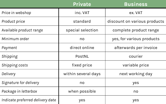 If you wish to order our products on a regular basis you can request a business account. For business customers we have a wider assortment of products, adjusted prices and different delivery conditions. When applying for a business account, please mention which products you expect to use and in what kind of situation you will apply these. Business customers from outside of the Netherlands are very welcome.