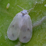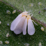 Despite their name, whiteflies are actually not flies. Instead, they belong to the group of true bugs, like aphids, mealy bugs and scale insects. Adults are 2-3 mm, have wings and have the ability to fly. Only early stage larvae have legs and are mobile. The younger stages usually settle on the underside of the leaf. The larvae are oval-shaped and translucent white to yellow. The last larval stage is a cocoon, which looks like a little box on the leaves. Adult whiteflies will emerge through a T-shaped tear in the cocoon.