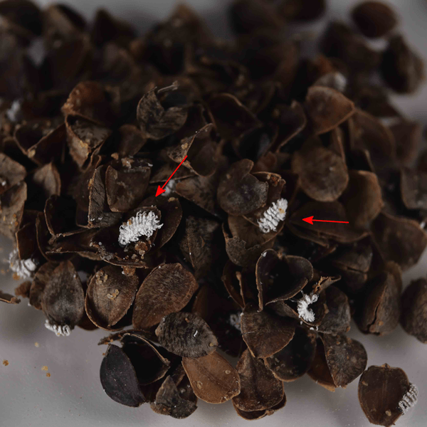 This products contains larvae of the predatory beetle Cryptolaemus montrouzieri. These larvae are covered in white; waxy filaments and resemble mealybugs. However; the beetle larvae move faster and are fluffier than the mealybugs.