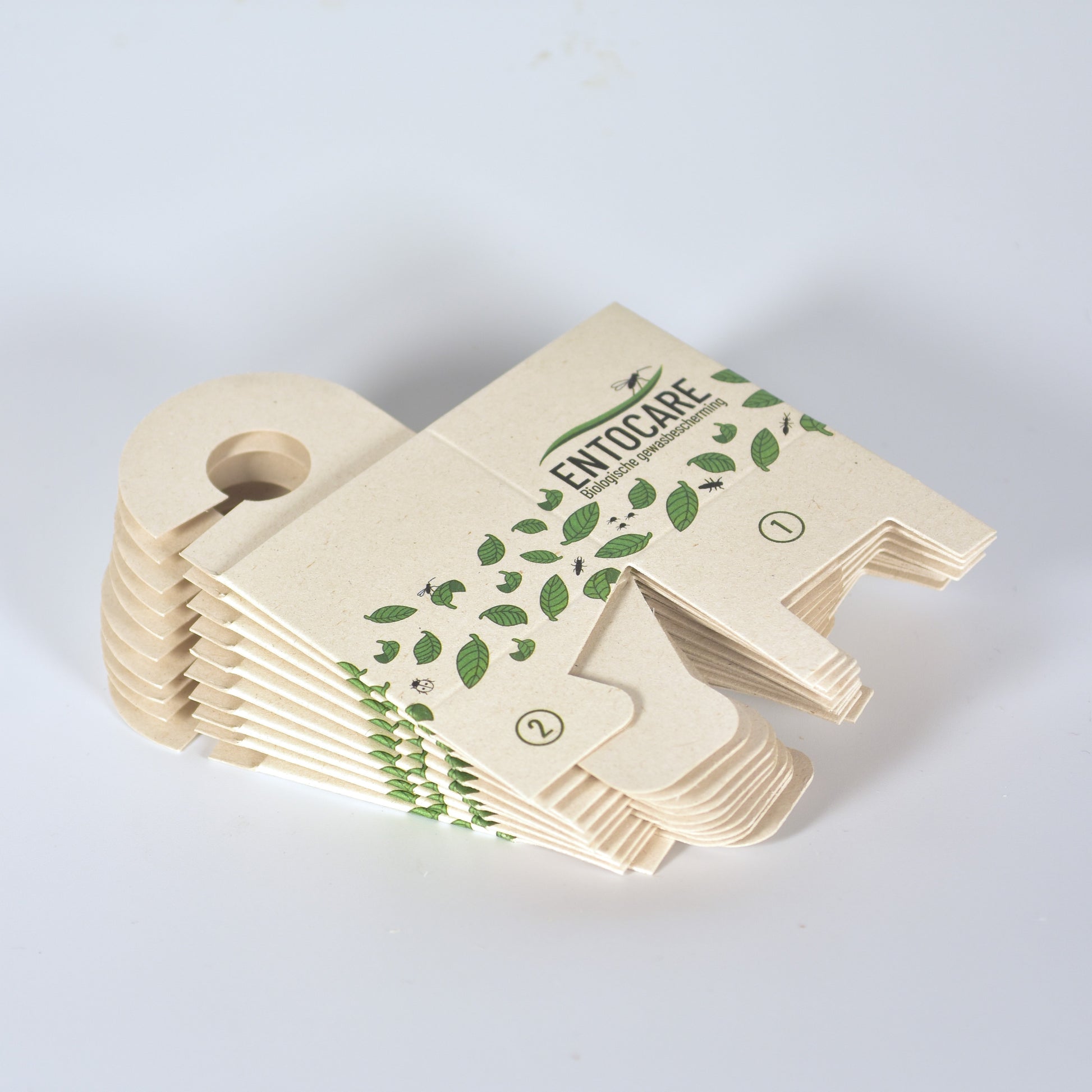 Na ontvangst kun je de ENTOBOX heel eenvoudig tot een bakje vouwen. Gebruik daarvoor de nummertjes op de flapjes aan de onderkant. Verdeel de inhoud van het flesje of potje, waarin het product is geleverd, over de bakjes en hang ze met behulp van het ophanghaakje in de planten. Het haakje is zo gevormd dat je het gemakkelijk over een stengel kunt schuiven. De biologische bestrijders kruipen of vliegen zelf uit het bakje en vinden hun weg naar de plaag. Als je een product gebruikt met larven is het belangrijk om de bakjes dicht in de buurt van de ergste aantasting te hangen. De bestrijders hoeven dan maar een korte weg af te leggen naar hun prooi.