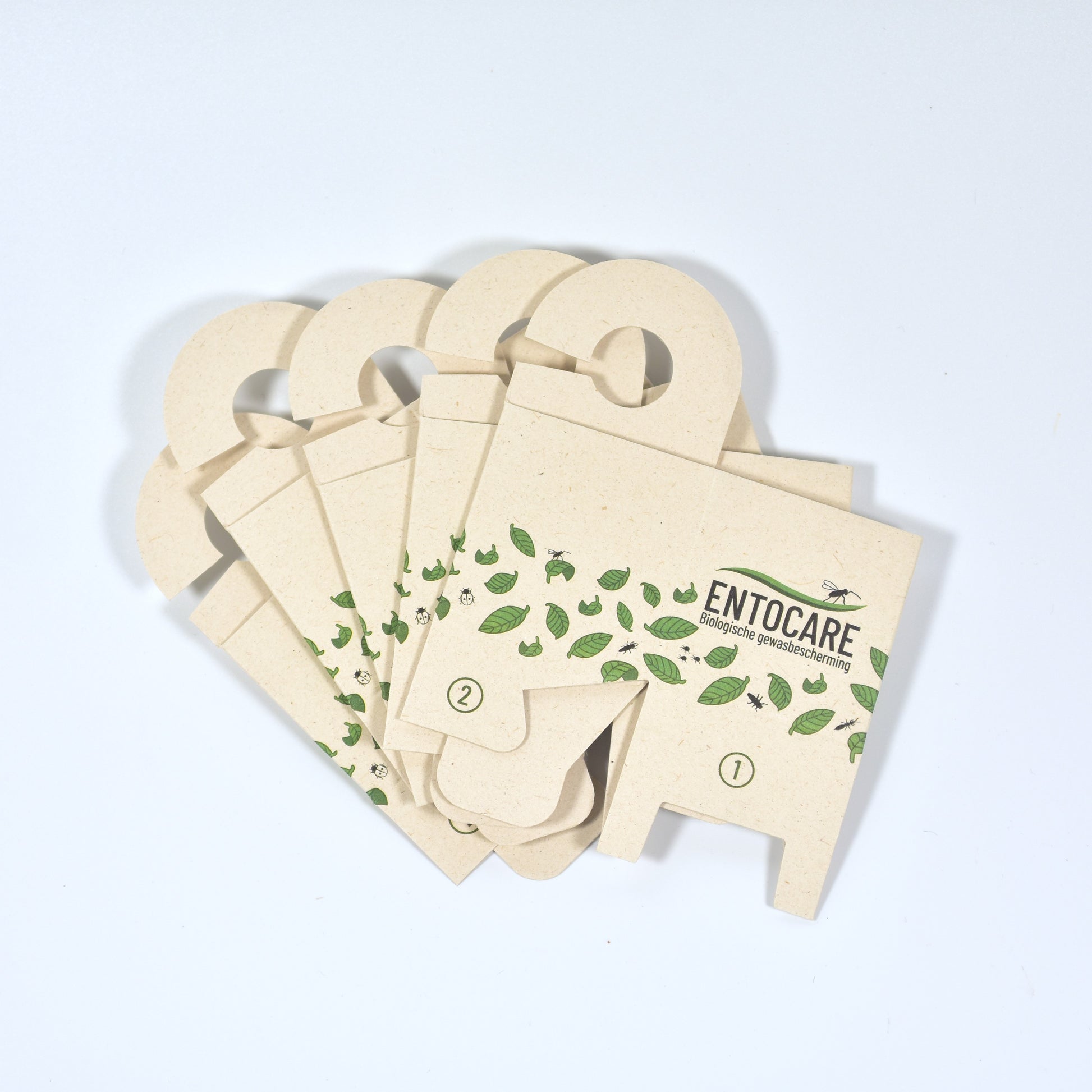Na ontvangst kun je de ENTOBOX heel eenvoudig tot een bakje vouwen. Gebruik daarvoor de nummertjes op de flapjes aan de onderkant. Verdeel de inhoud van het flesje of potje, waarin het product is geleverd, over de bakjes en hang ze met behulp van het ophanghaakje in de planten. Het haakje is zo gevormd dat je het gemakkelijk over een stengel kunt schuiven. De biologische bestrijders kruipen of vliegen zelf uit het bakje en vinden hun weg naar de plaag. Als je een product gebruikt met larven is het belangrijk om de bakjes dicht in de buurt van de ergste aantasting te hangen. De bestrijders hoeven dan maar een korte weg af te leggen naar hun prooi.