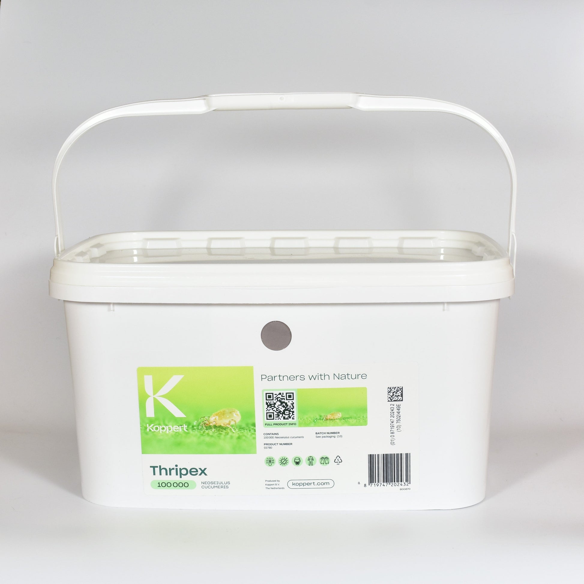 THRIPEX is een roofmijt die je kunt inzetten voor de biologische bestrijding van eitjes en larven van o.a. tabakstrips en Californische trips. De roofmijten vreten ook spintmijten en andere schadelijke mijten. Dit product kun je gebruiken in kassen als de luchtvochtigheid regelmatig hoger is dan 75 %. Ook voor preventief gebruik. THRIPEX wordt geleverd in bussen van 1000 ml die 50.000 roofmijten bevatten in zemelen met voermijten. De voermijten kunnen lichte schade geven aan gevoelige gewassen.