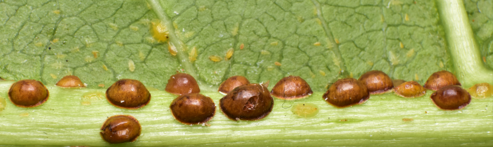 De dop is vergroeid met het lichaam (bij schildluizen kun je het schild van het lichaam aflichten). Onder de dop vind je enorme hoeveelheden eitjes. Uit de eitjes ontwikkelen zich de zogenaamde crawlers. Dit stadium is zeer actief en ze zullen zich snel verspreiden over de plant. De oudere stadia zitten bijna onbeweeglijk op de plant, vaak evenwijdig aan de nerven van het blad of op de stengel.