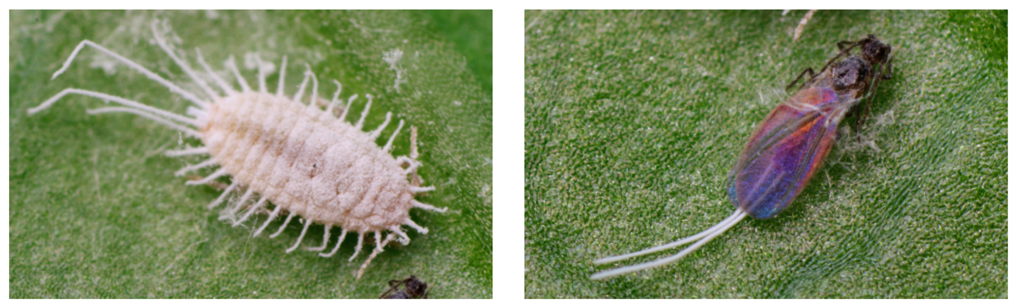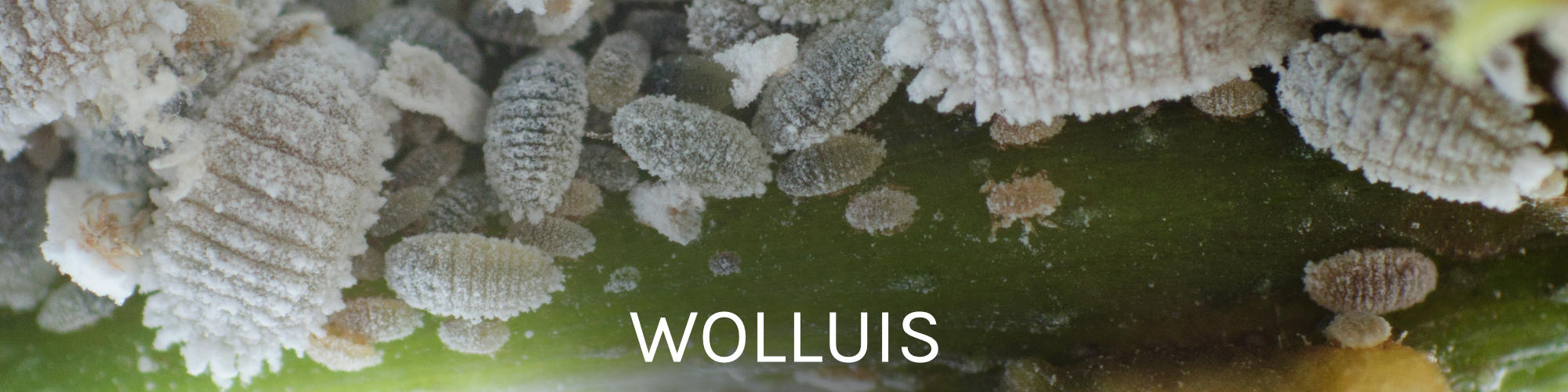 Wolluizen zijn kleine plantenluizen die meestal stilzitten op de plant. Hun lichaam is bedekt met een laag witte was, daaraan hebben ze hun naam te danken. Je kunt ze op allerlei planten vinden, zowel in sierteelt als in glasgroententeelt. Wat we voor het gemak wolluis noemen zijn in feite verschillende soorten. Allemaal hebben ze een lichaam dat met witte wasdraden bedekt is maar ze verschillen uiterlijk van elkaar in de lengte van hun (staart)haren, het streeppatroon op hun rug en in de kleur van hun lichaam.